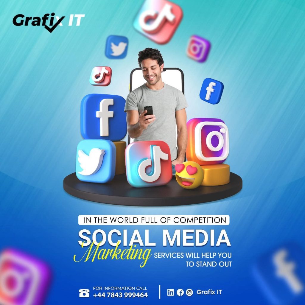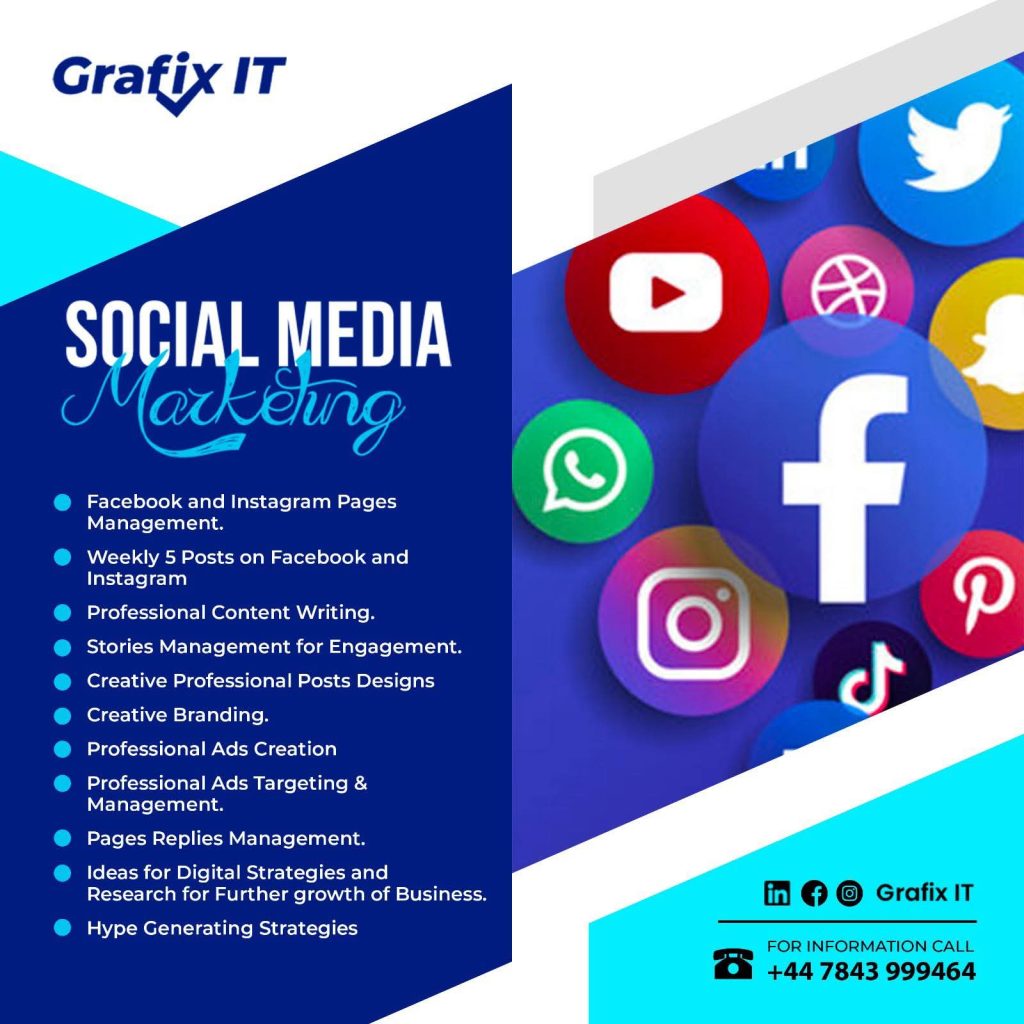 Grafix IT Solutions is a professional digital marketing agency specializing in social media marketing and brand development for international clients. We help businesses build a strong online presence across platforms like Facebook, Instagram, and TikTok, creating engaging content that reflects your brand identity. Our team also designs and manages highly targeted ad campaigns to reach the right audience, generate quality leads, and drive measurable business growth. Whether you’re looking to increase visibility, boost engagement, or grow your sales, Grafix IT Solutions is your trusted partner in achieving real marketing success.